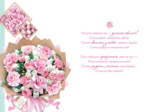 Наступил звездный час — золотой юбилей! Сколько ярких, прекрасных цветов, Сколько светлых улыбок родных и друзей, Сколько добрых и искренних слов! Пусть побольше прекрасного ждет на пути — Много солнечных, праздничных дней! Столько радости, счастья еще впереди… И еще не один юбилей!