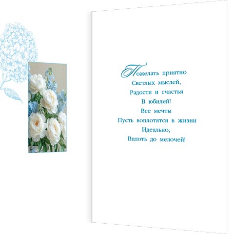 Пожелать приятно Светлых мыслей, Радости и счастья В юбилей! Все мечты Пусть воплотятся в жизни Идеально, Вплоть до мелочей!