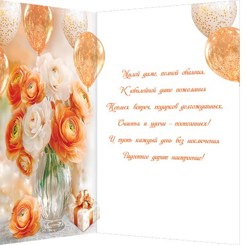 Милой даме, полной обаяния, К юбилейной дате пожелания Теплых встреч, подарков долгожданных, Счастья и удачи — постоянных! И пусть каждый день без исключения Радостное дарит настроение!