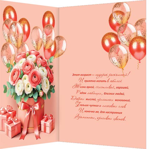 Этот возраст — подарок роскошный! И приятно желать в юбилей Жизни яркой, счастливой, хорошей, Рядом любящих, близких людей, Добрых мыслей, приятных мгновений, Больше чутких и ласковых слов И, конечно же, для настроения Ароматных, красивых цветов.