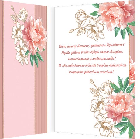 251 x 194 мм Всего самого теплого, уютного и душевного! Пусть рядом всегда будут самые близкие, внимательные и любящие люди! И от сегодняшнего юбилея в сердце останется ощущение радости и счастья! |