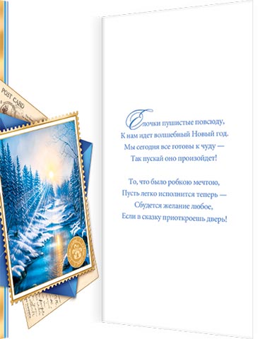 Елочки пушистые повсюду, К нам идет волшебный Новый год. Мы сегодня все готовы к чуду — Так пускай оно произойдет! То, что было робкою мечтою, Пусть легко исполнится теперь — Сбудется желание любое, Если в сказку приоткроешь дверь!