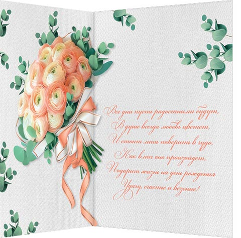 Все дни пусть радостными будут, В душе всегда любовь цветет, И стоит лишь поверить в чудо, Как вмиг оно произойдет, Подарит жизнь на день рождения Удачу, счастье и везение!