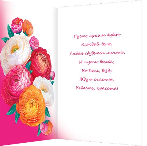 Пусть ярким будет каждый день, Любая сбудется мечта, И пусть всегда, во всем, везде Ждут счастье, радость, красота!