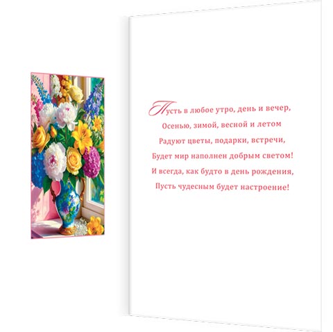 Пусть в любое утро, день и вечер, Осенью, зимой, весной и летом Радуют цветы, подарки, встречи, Будет мир наполнен добрым светом! И всегда, как будто в день рождения, Пусть чудесным будет настроение!