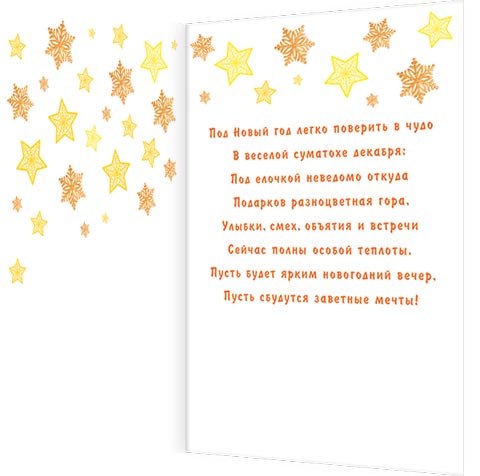 Под Новый год легко поверить в чудо В веселой суматохе декабря: Под елочкой неведомо откуда Подарков разноцветная гора, Улыбки, смех, объятия и встречи Сейчас полны особой теплоты. Пусть будет ярким новогодний вечер, Пусть сбудутся заветные мечты!