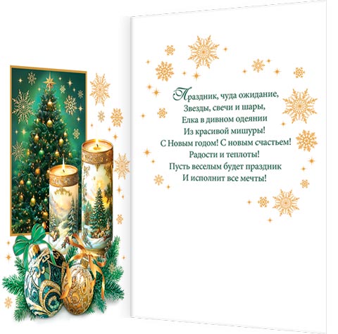 Праздник, чуда ожидание, Звезды, свечи и шары, Елка в дивном одеянии Из красивой мишуры! С Новым годом! С новым счастьем! Радости и теплоты! Пусть веселым будет праздник И исполнит все мечты!