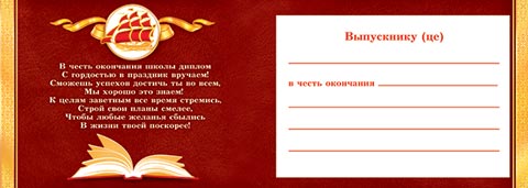 В честь окончания школы диплом С гордостью в праздник вручаем! Сможешь успехов достичь ты во всем, Мы хорошо это знаем! К целям заветным все время стремись, Строй свои планы смелее, Чтобы любые желанья сбылись В жизни твоей поскорее!