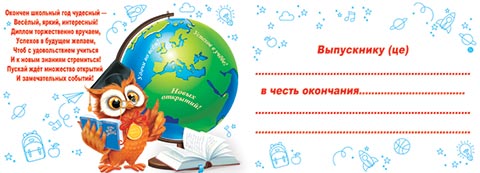 Окончен школьный год чудесный — Весёлый, яркий, интересный! Диплом торжественно вручаем, Успехов в будущем желаем, Чтоб с удовольствием учиться И к новым знаниям стремиться! Пускай ждет множество открытий И замечательных событий!