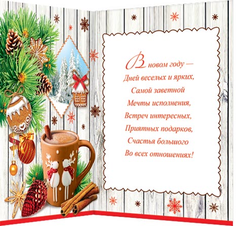В новом году — Дней веселых и ярких, Самой заветной Мечты исполнения, Встреч интересных, Приятных подарков, Счастья большого Во всех отношениях!