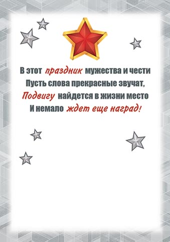 В этот праздник мужества и чести Пусть слова прекрасные звучат, Подвигу найдется в жизни место И немало ждет еще наград!